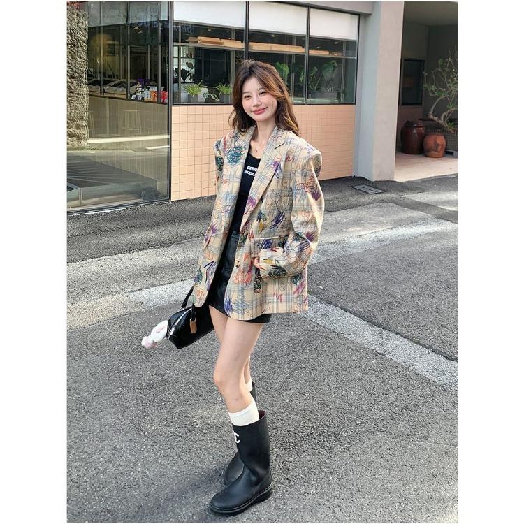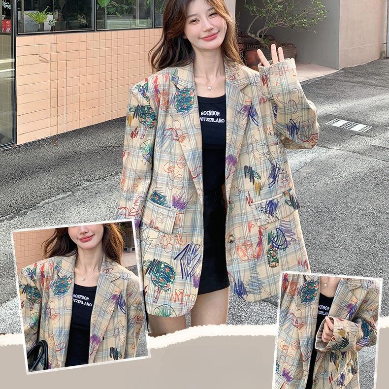 Шикарный пиджак с принтом граффити для женщин на осень, корейский стиль, повседневная уличная мода, идеально подходит для миниатюрных фигур