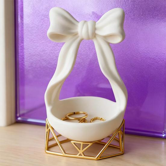 Представляем изысканный поднос для украшений, изготовленный из высококачественного полимерного материала для гладкой и долговечной отделки.. Этот поднос разработан с неглубокой чашей для надежного хранения ваших драгоценных ювелирных изделий, таких как кольца и серьги, обеспечивая, что они всегда будут организованы и в пределах досягаемости.. Уникальная форма банта добавляет нотку элегантности и женственности любому пространству, что делает его идеальным дополнением к вашему домашнему декору.