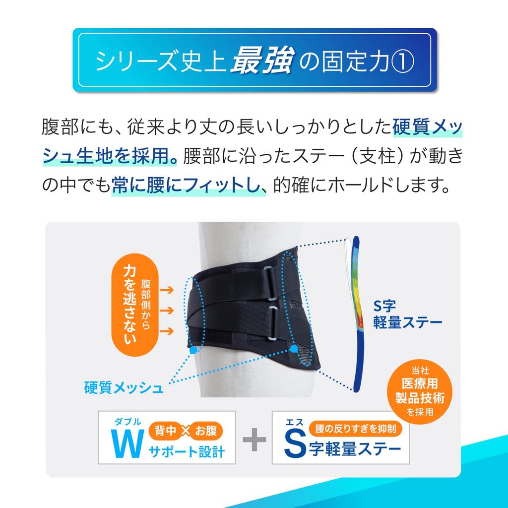 [Самая сильная поддержка в серии①]: Легкая стойка S-образной формы (поддержка) встроенный в спину, который также используется в наших медицинских изделиях, предотвращает чрезмерный прогиб поясницы. Кроме того, пояс W-образной поддержки с двумя регуляторами, который еще прочнее предыдущей модели, обеспечивает сильную поддержку поясницы.
