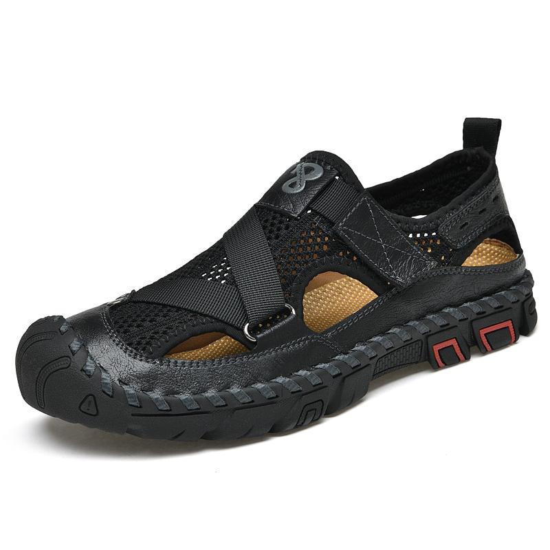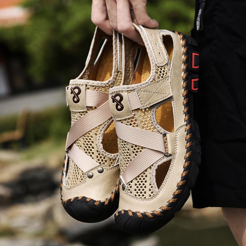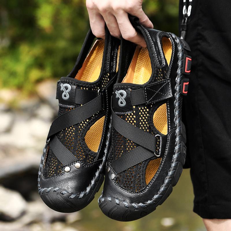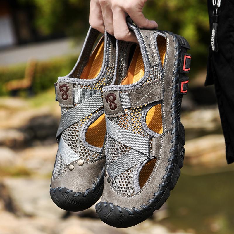 Breathable Mens Sandals Handmade Leather Male Summer Shoes Outdoor Walking Beach Flats Cool Mesh Sneakers Non-Slip Men Sandalias
