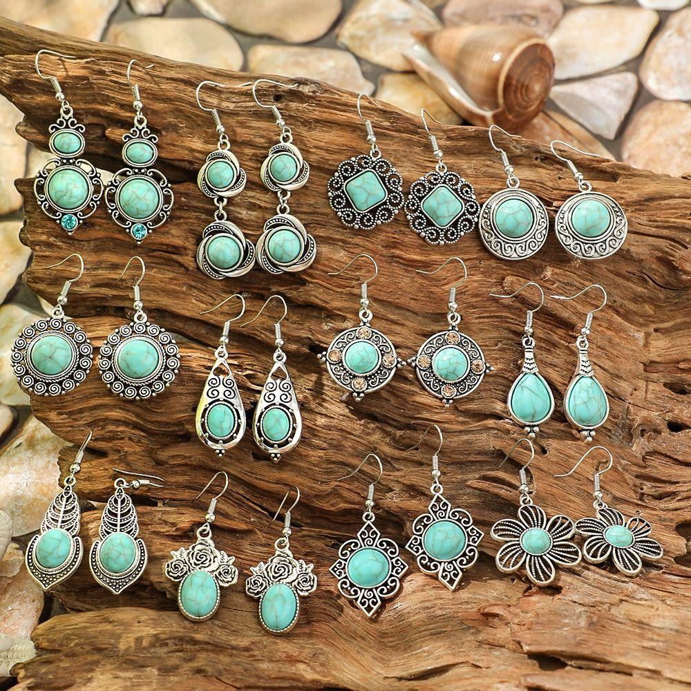 3pair Silver Color Turquoises Earrings Set Carved Drop Earrings Vintage Dangle Earrings Girl