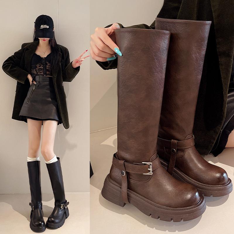 Модные ретро ботинки на толстой подошве 2025 осень и зима женские ботинки толстый каблук высокая высота голенища и стройность удобные рыцарские ботинки