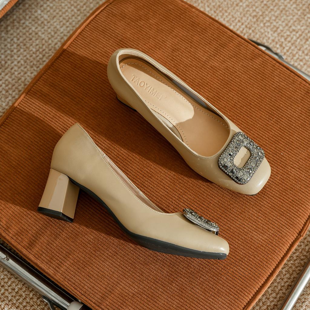 Leather square head thick heel low heel single shoes women are not tired of standing for a long time professional commuter work shoes rhinestone