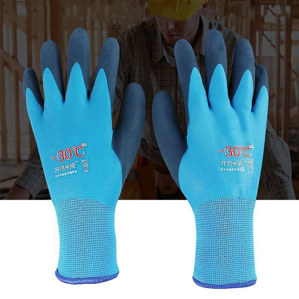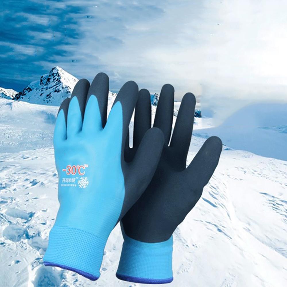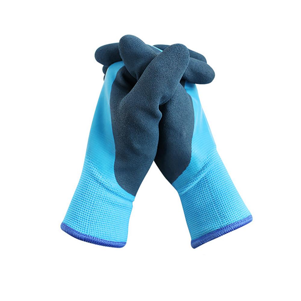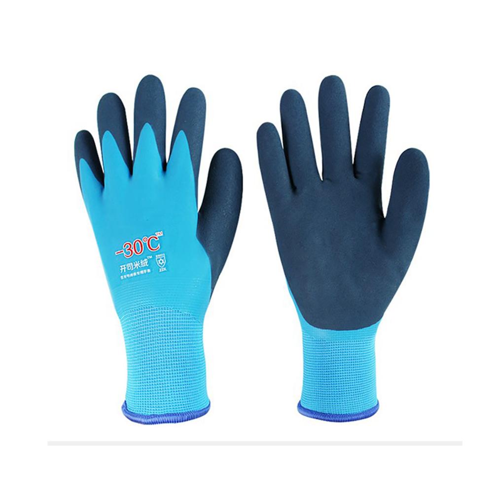Пара синих водонепроницаемых термоизолированных рабочих перчаток с термолатексным покрытием.