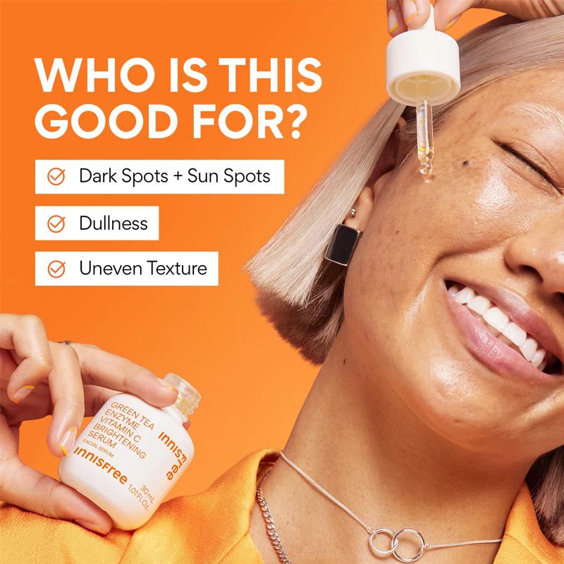 Одновременный контроль над несовершенствами и отшелушивание! Не просто обычная сыворотка от несовершенств, а Тонизирующая сыворотка от несовершенств! Необходимо воздействовать не только на видимые несовершенства, появившиеся на эпидермисе, но и на невидимый меланин внутри кожи.. Новая формула Innisfree, сочетающая двойной витамин С и энзим зеленого чая с Чеджу, специально разработана для контроля над несовершенствами и отшелушивания кожи.