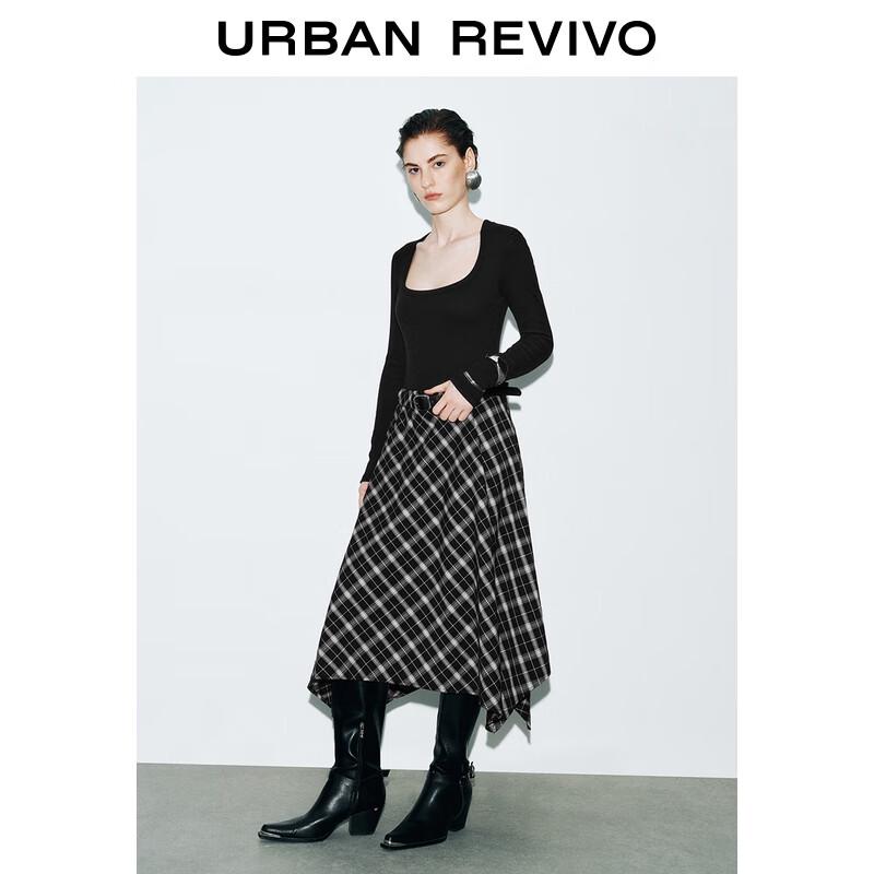 Женское платье А-силуэта в клетку пэчворк с поясом UR Осень 2025
