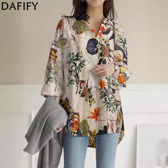 DAFIFY Женские модные повседневные весенне-осенние блузки и рубашки с v-образным вырезом и длинными рукавами с цветочным узором и принтом