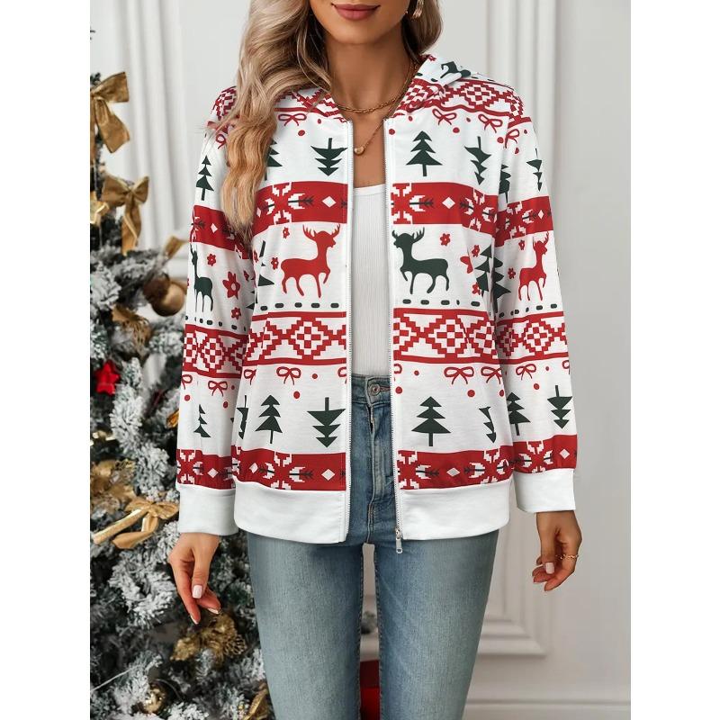 Женская повседневная куртка с капюшоном с элементами рождественского оленя и дерева, создающими праздничную атмосферу