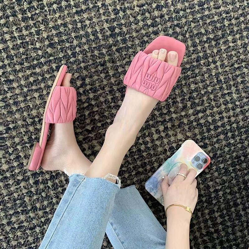 Korean version of pleated square head one-word sandals women's summer 2025 new fashion letter flat bottom outside casual slippers