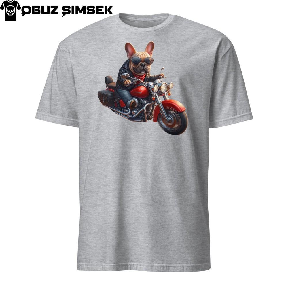 Футболка унисекс с коротким рукавом «Французский бульдог на мотоцикле» | Уникальная футболка для любителей собак