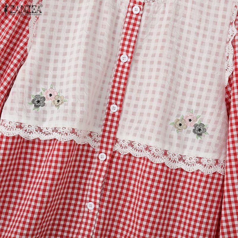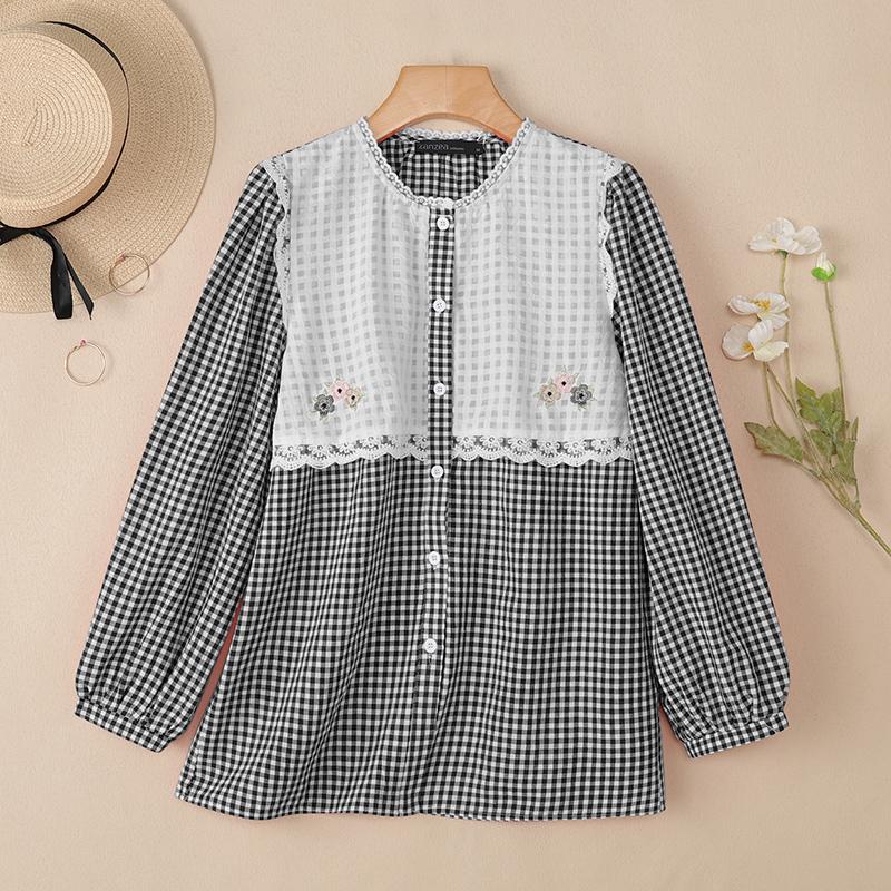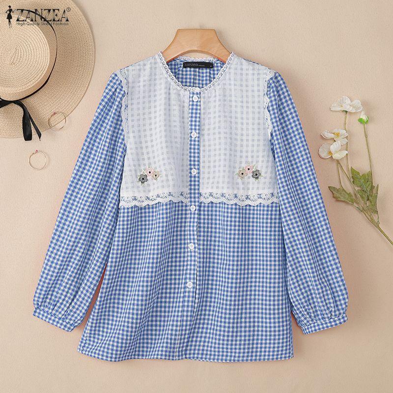 ZANZEA Женская повседневная блузка в клетку пэчворк с круглым вырезом, свободного кроя, с длинным рукавом