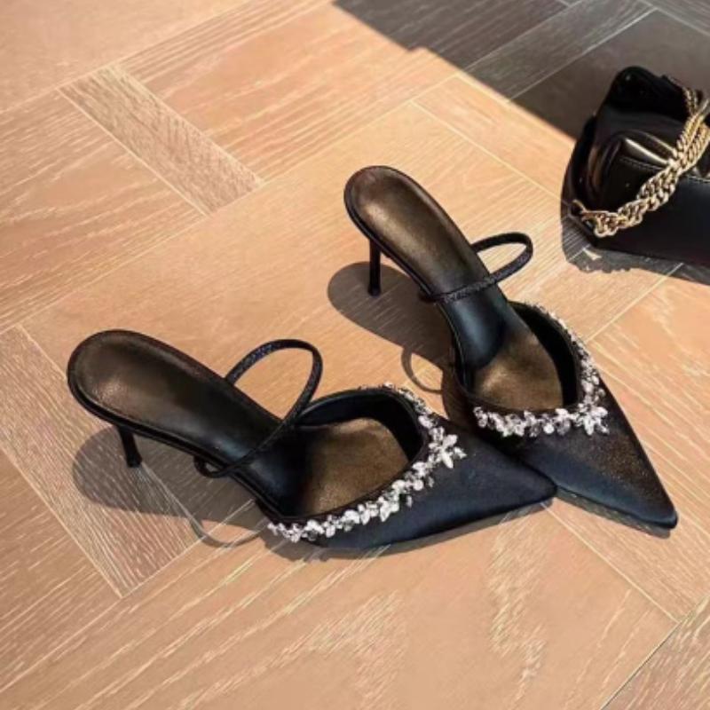 Современные босоножки на высоком каблуке с острым носком Женские летние на тонком каблуке Абрикосовые с кристальным дизайном Офисная обувь Женская Роскошная обувь для вечеринок Мухер