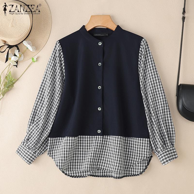 ZANZEA Женская повседневная блузка с круглым вырезом, клетчатым принтом и длинными рукавами