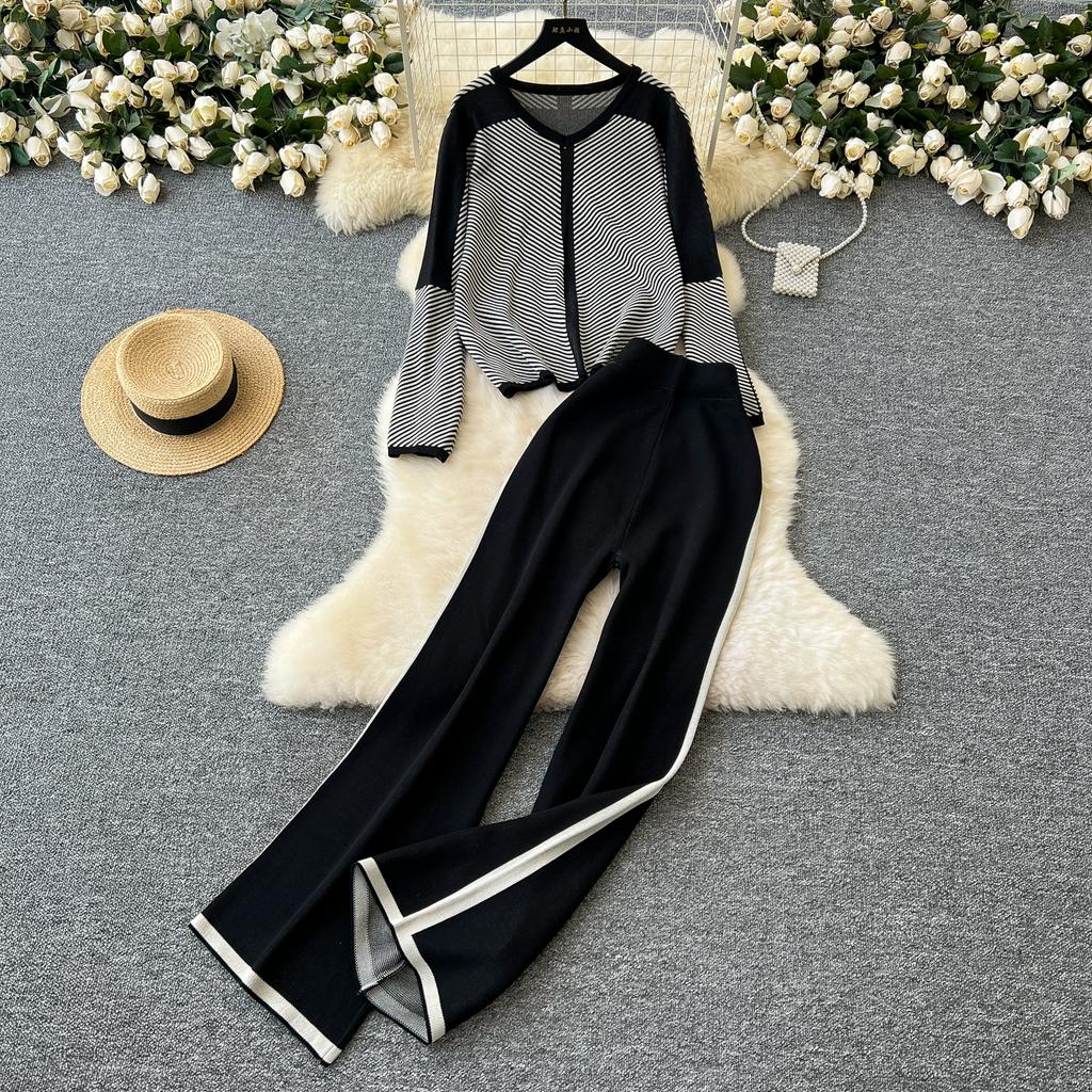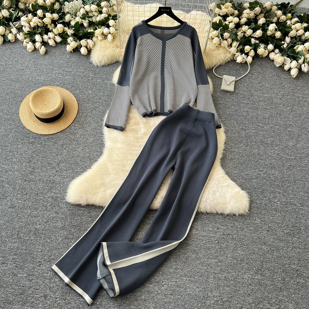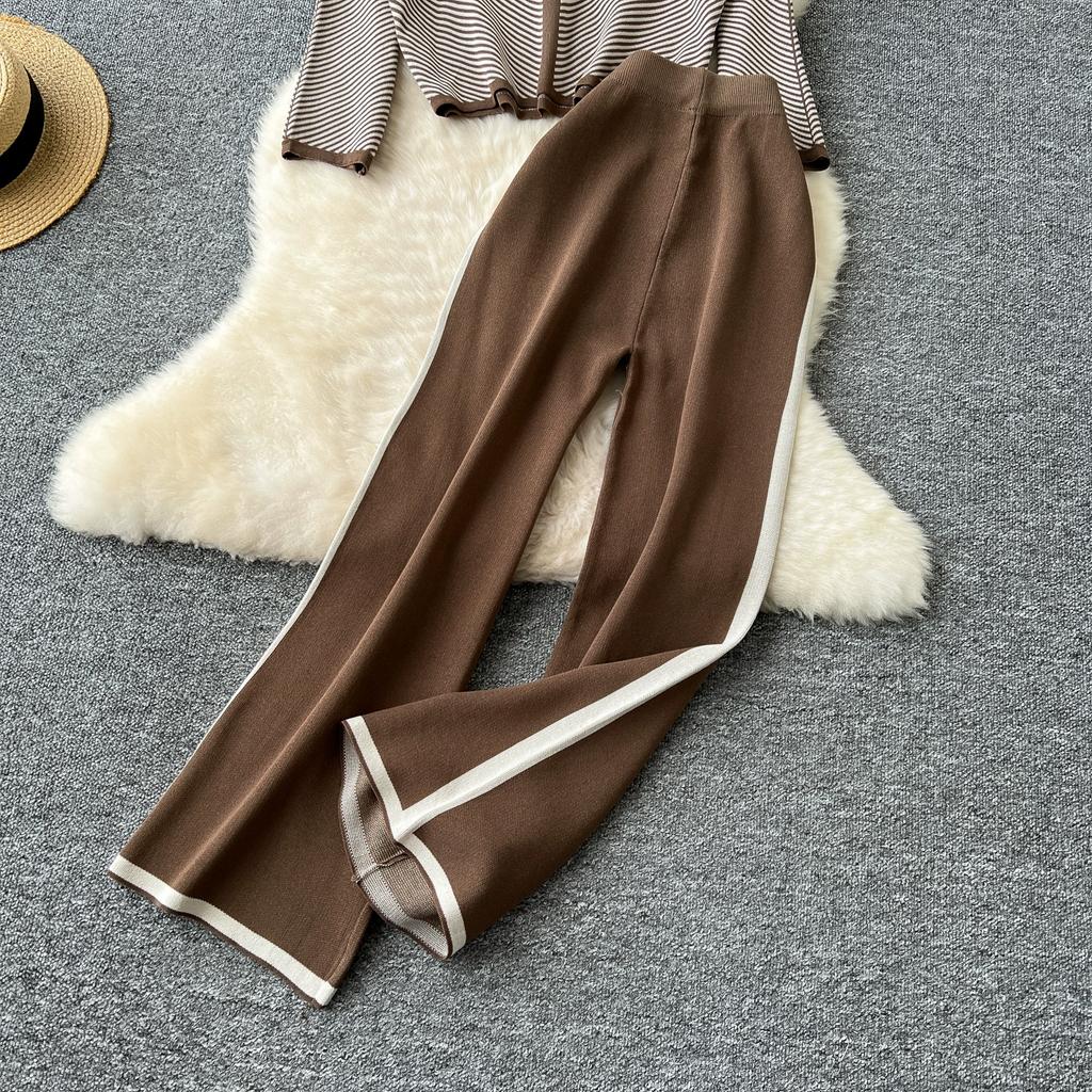 Осень Зима Женский Повседневный Полосатый Вязаный Свитер Брюки Комплект из Двух Предметов V-образный Вырез Пуловер Топы и Брюки с Широкими Штанинами Спортивный Костюм