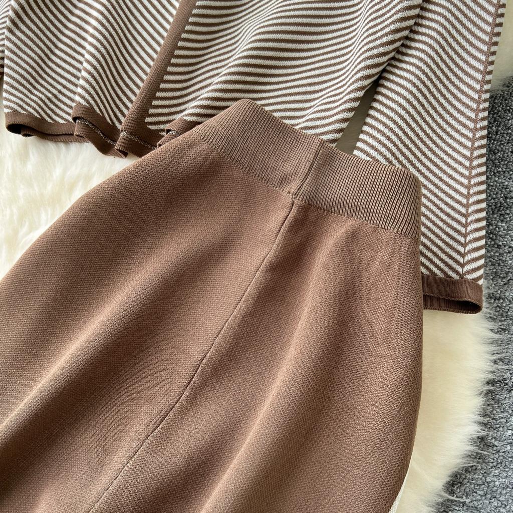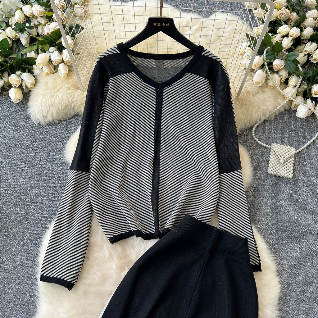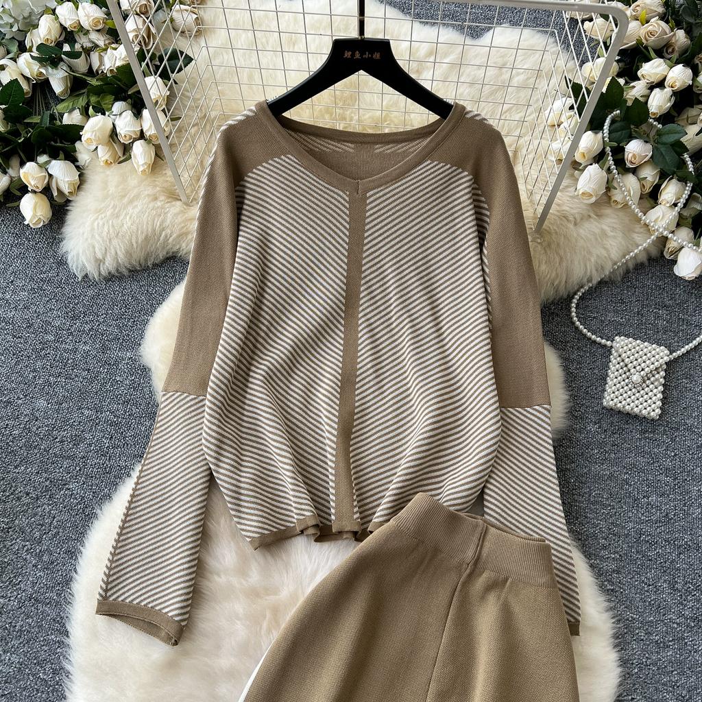 Осень Зима Женский Повседневный Полосатый Вязаный Свитер Брюки Комплект из Двух Предметов V-образный Вырез Пуловер Топы и Брюки с Широкими Штанинами Спортивный Костюм