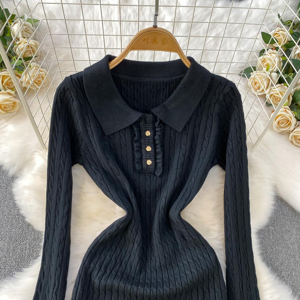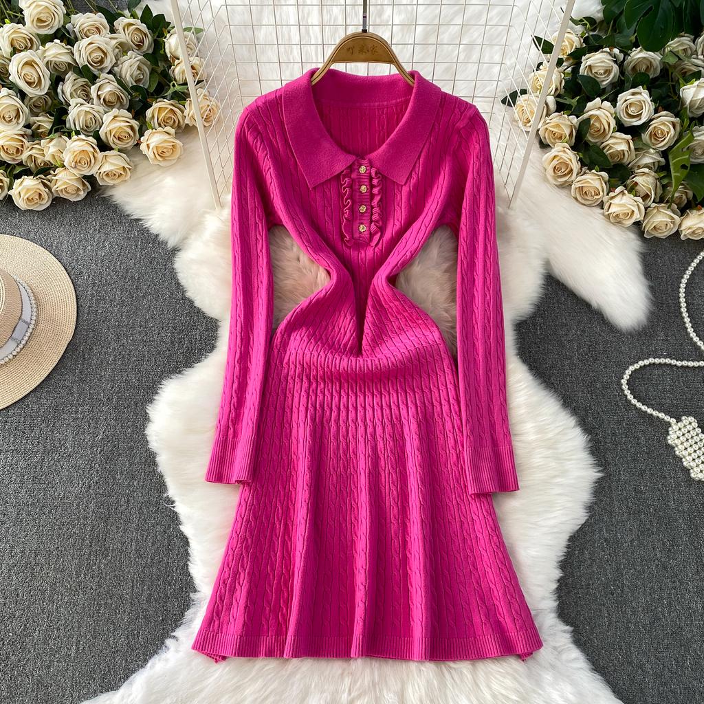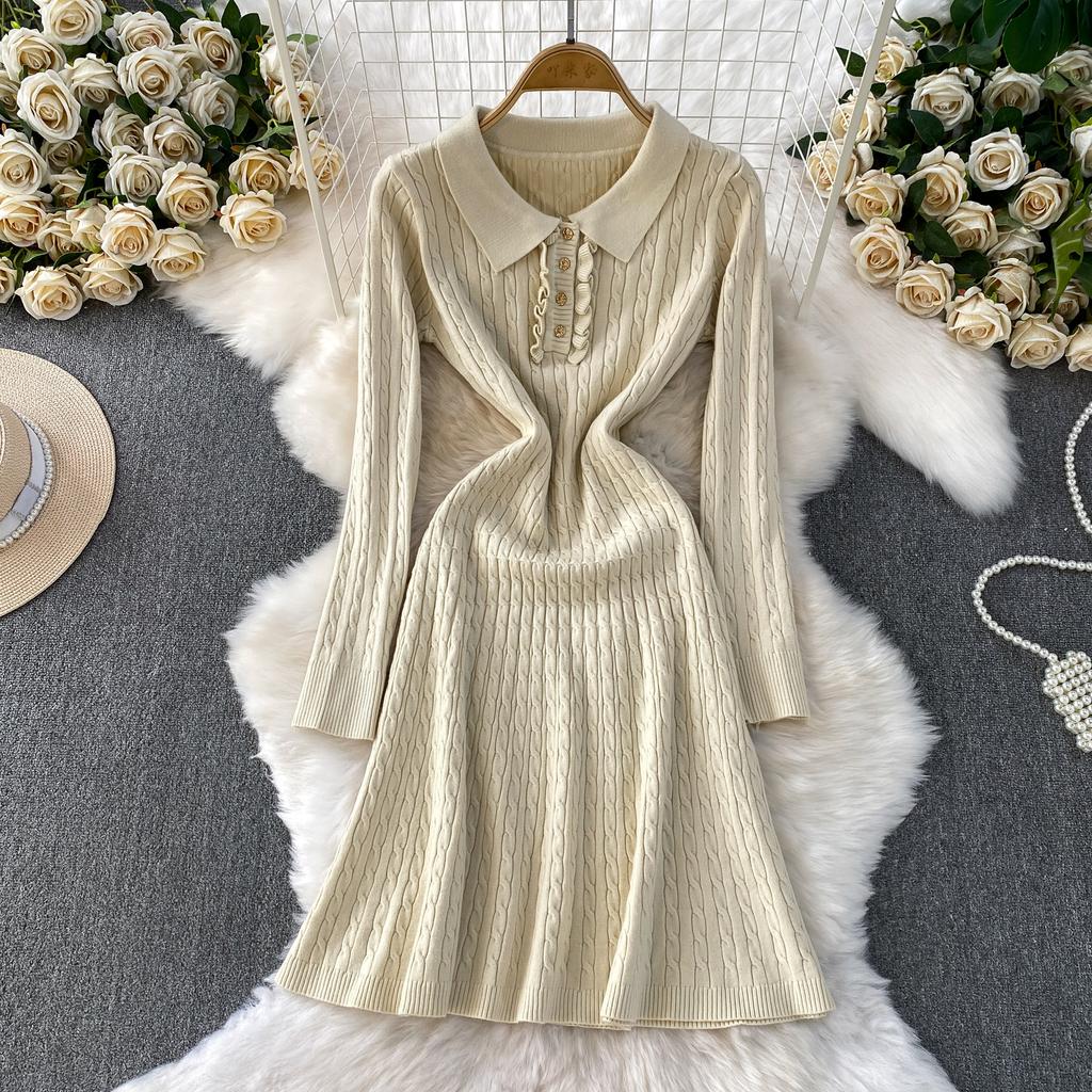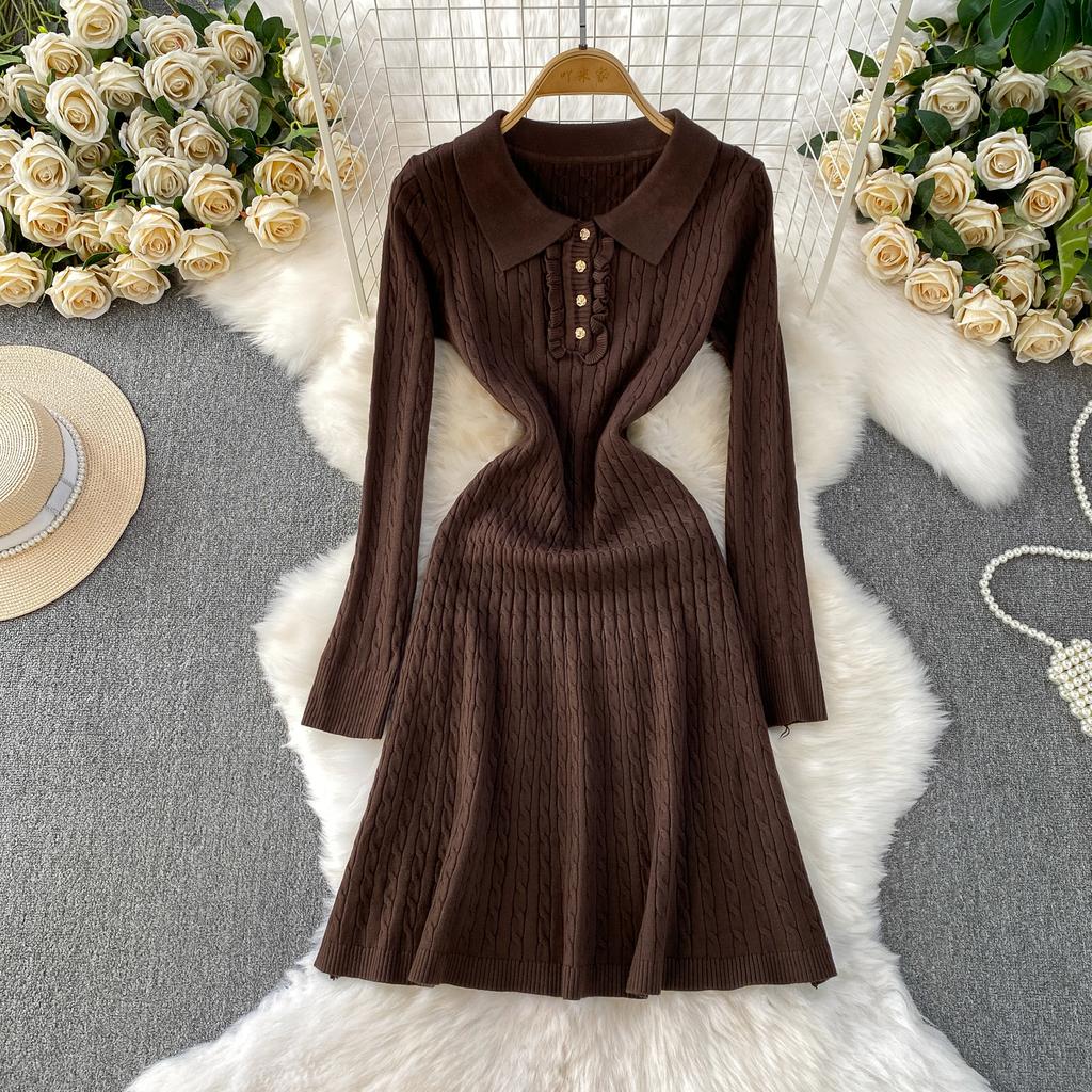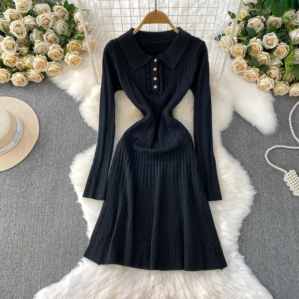 Осень Зима Платья-зонтики вязаные поло с высокой талией Новые Повседневные платья А-силуэта свободного кроя с длинным рукавом Женские