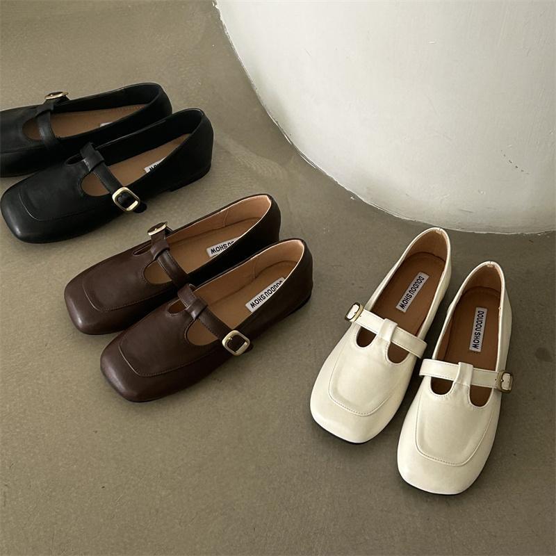 Французские ретро туфли бабушки с квадратным носком 2025 новые туфли Мэри Джейн с Т-образной застежкой темпераментные на плоской подошве маленькие кожаные туфли