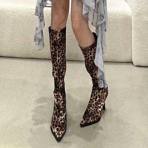 Европейский и американский стиль остроносые леопардовые ботфорты женские 2025 весна и осень тонкий каблук высокие сапоги задняя молния высокий каблук сапоги-чулки