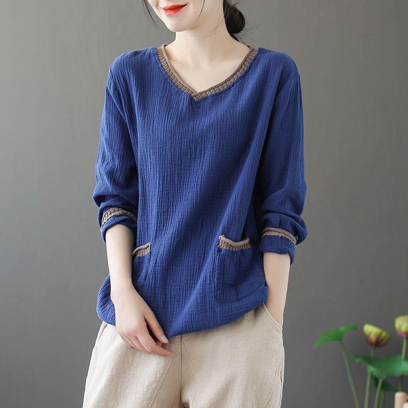 Ретро однотонная футболка с V-образным вырезом, корейская версия, свободная, с длинным рукавом, женская базовая футболка — купить товар онлайн с бесплатной доставкой до всему миру!