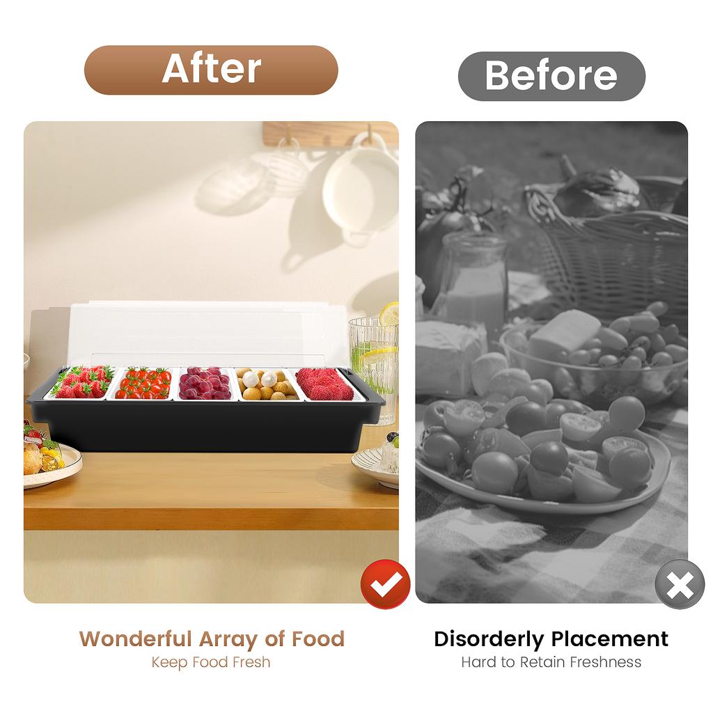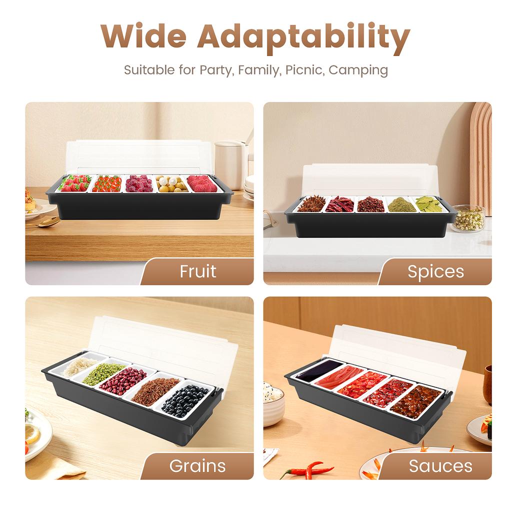 Fruit Veggie Condiment Caddy with Lid 5 Compartment Plastic Dispenser Tray for Catering Dips Toppings Serving Taco Ice Cream