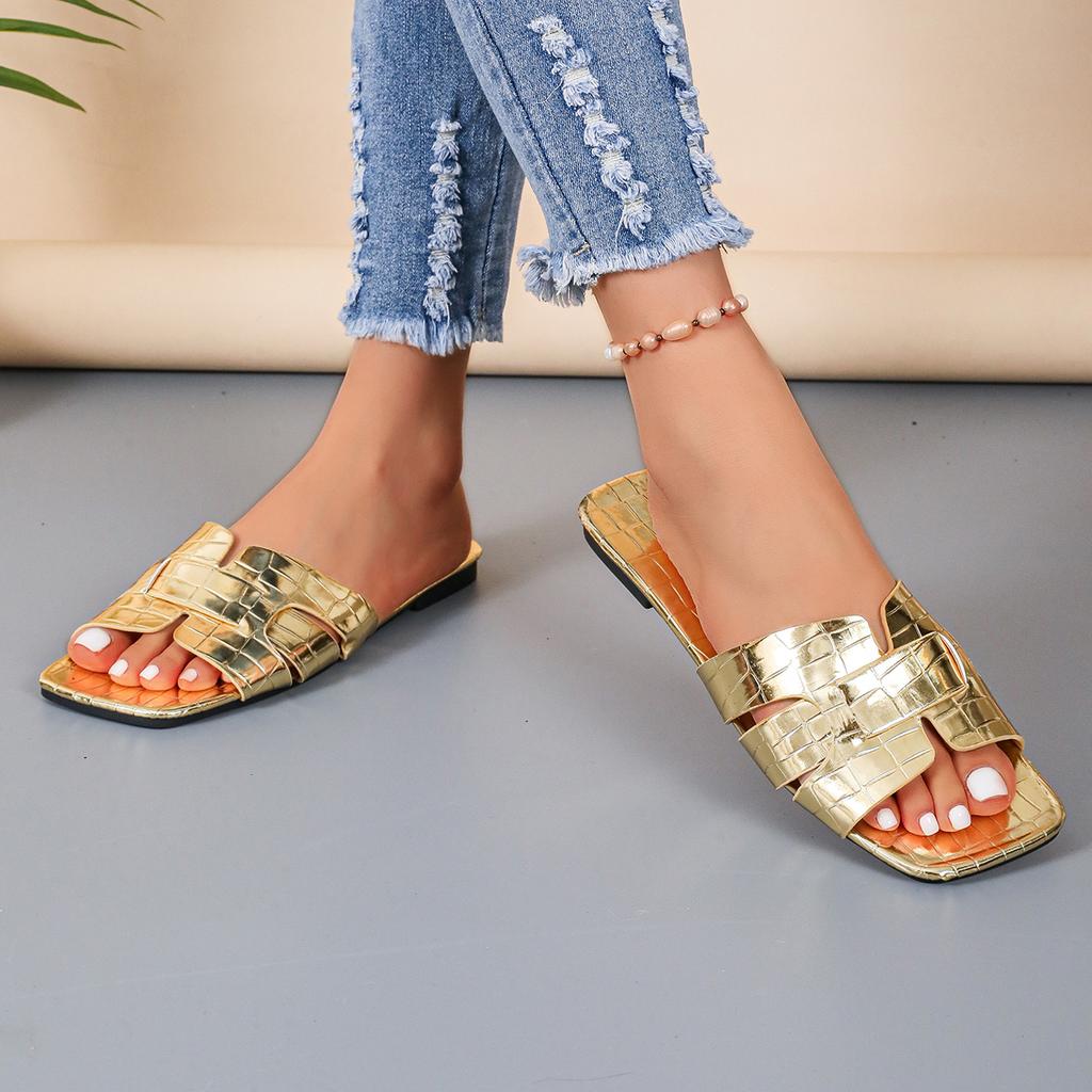Золотистые открытые туфли на плоской подошве с каблуком, кожаные сандалии, тапочки для ванной, пляжная обувь, удобные сандалии без застежек для женщин