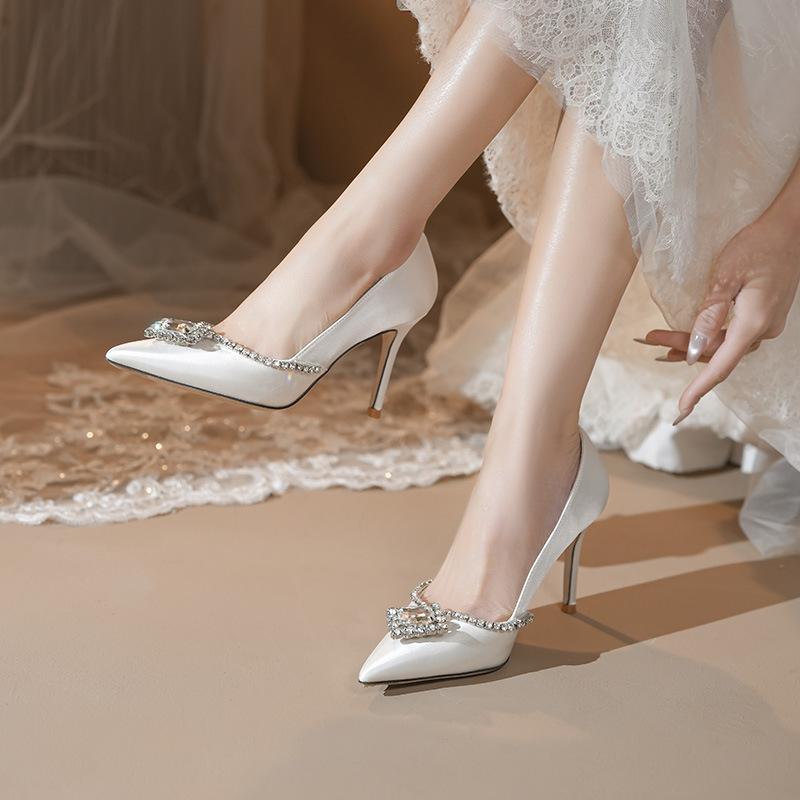 White Rhinestone High-heeled Shoes for Women 2025 New Pointed Thin Heel Satin French Wedding Dress Single Shoes Zaptos Mujer