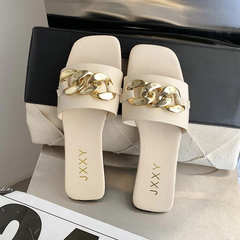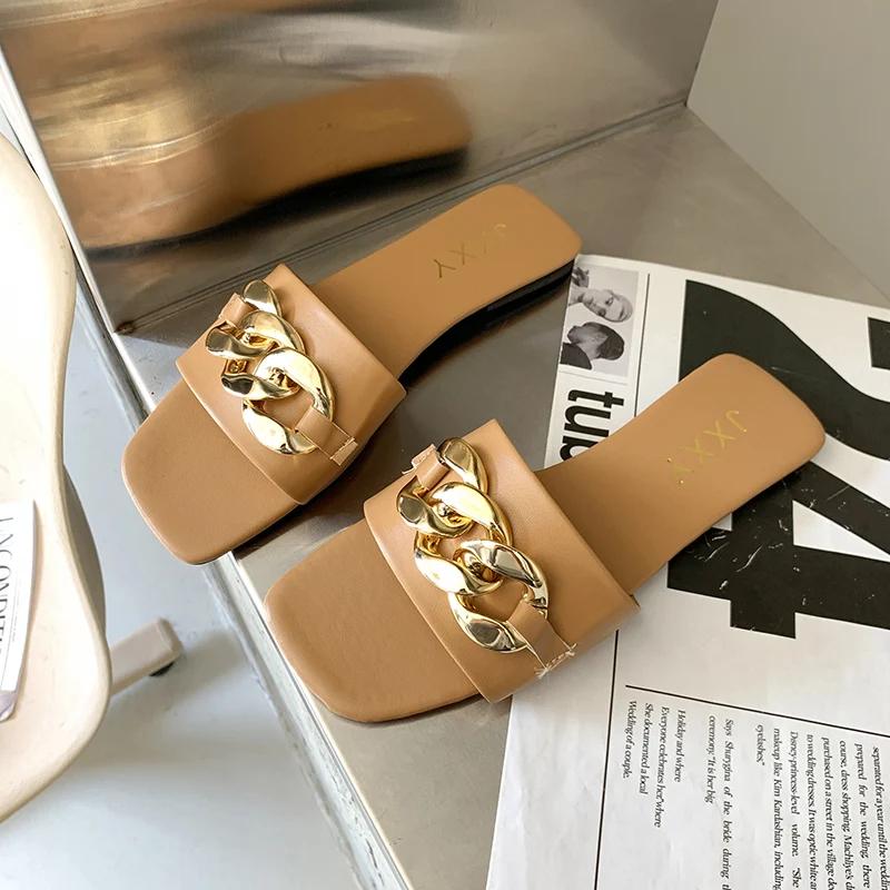 Новые женские тапочки 2024 года, тапочки с квадратным носком и цепочкой, плоские шлепанцы, пляжные шлепанцы, металлическая отделка, повседневная обувь