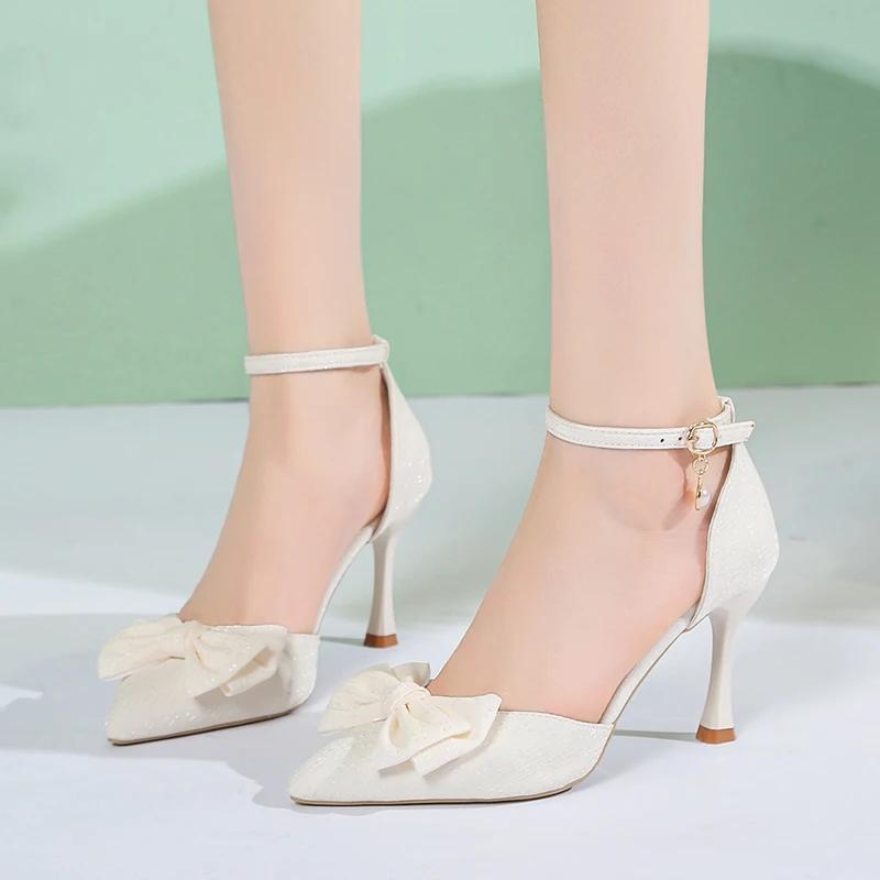 Летние сандалии 2024 года Женская новая обувь на тонком каблуке с ремешком с одной пряжкой, с вырезами, с острым носком, на высоком каблуке, с бантом, женская обувь