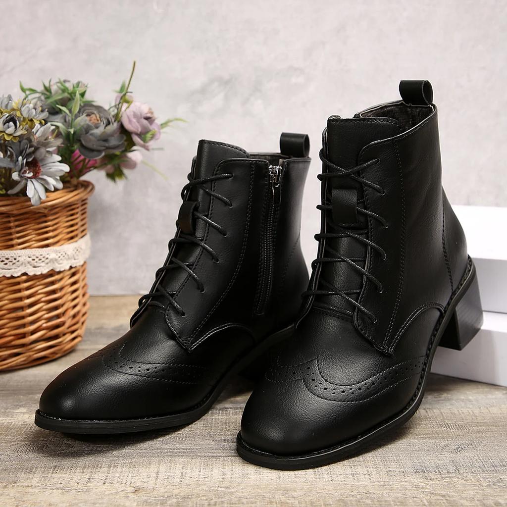 Женские ботильоны на квадратном каблуке средней высоты, универсальные, на шнуровке, с отделкой шнуровкой, на молнии, женские туфли-лодочки, кожаная обувь, осень-зима