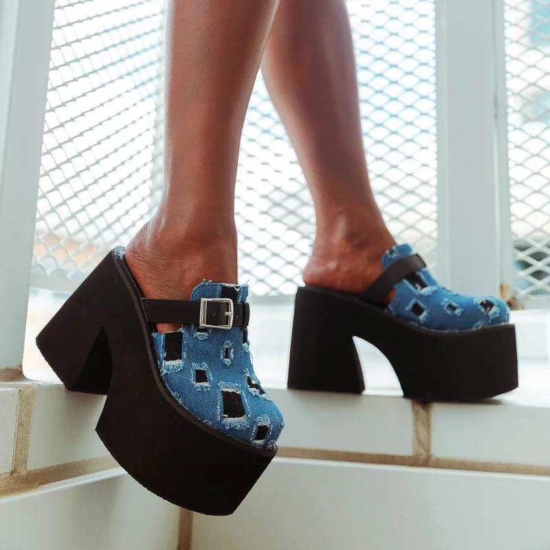 Обувь для женщин Сексуальные туфли на высоком каблуке Джинсовые туфли с рваным носком на толстом каблуке Туфли, увеличивающие рост, размер плюс 35-43