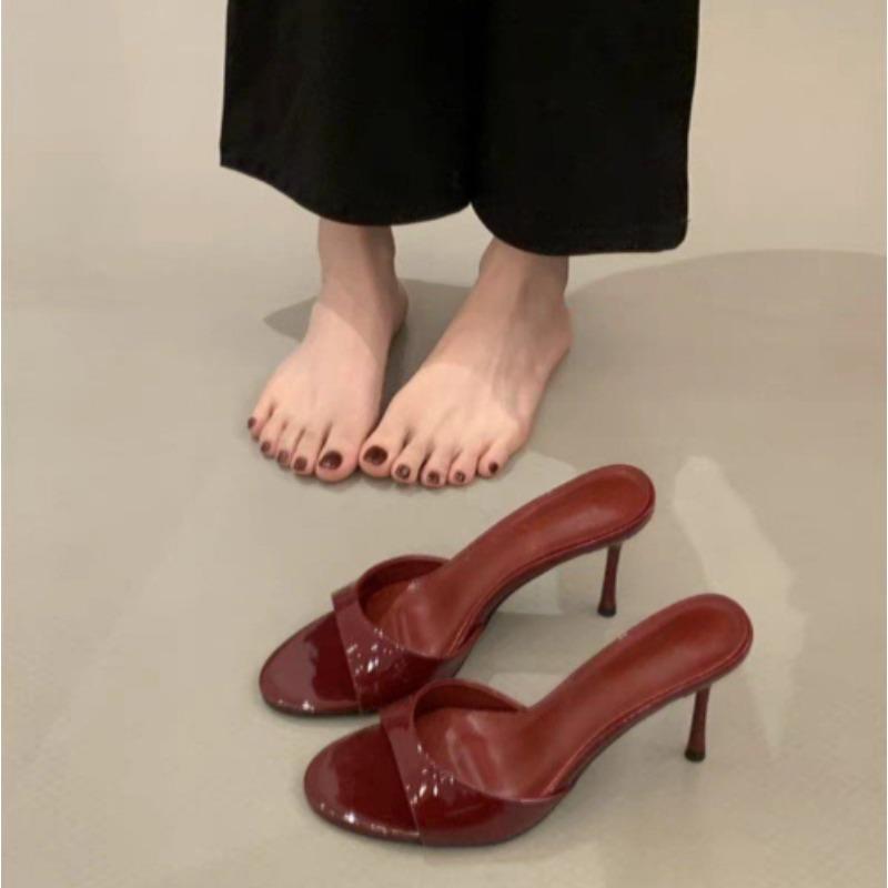 Бордовые лакированные женские тапочки-сандалии с круглым открытым носком, на тонком высоком каблуке, мюли, шлепанцы, летняя обувь для вечеринок