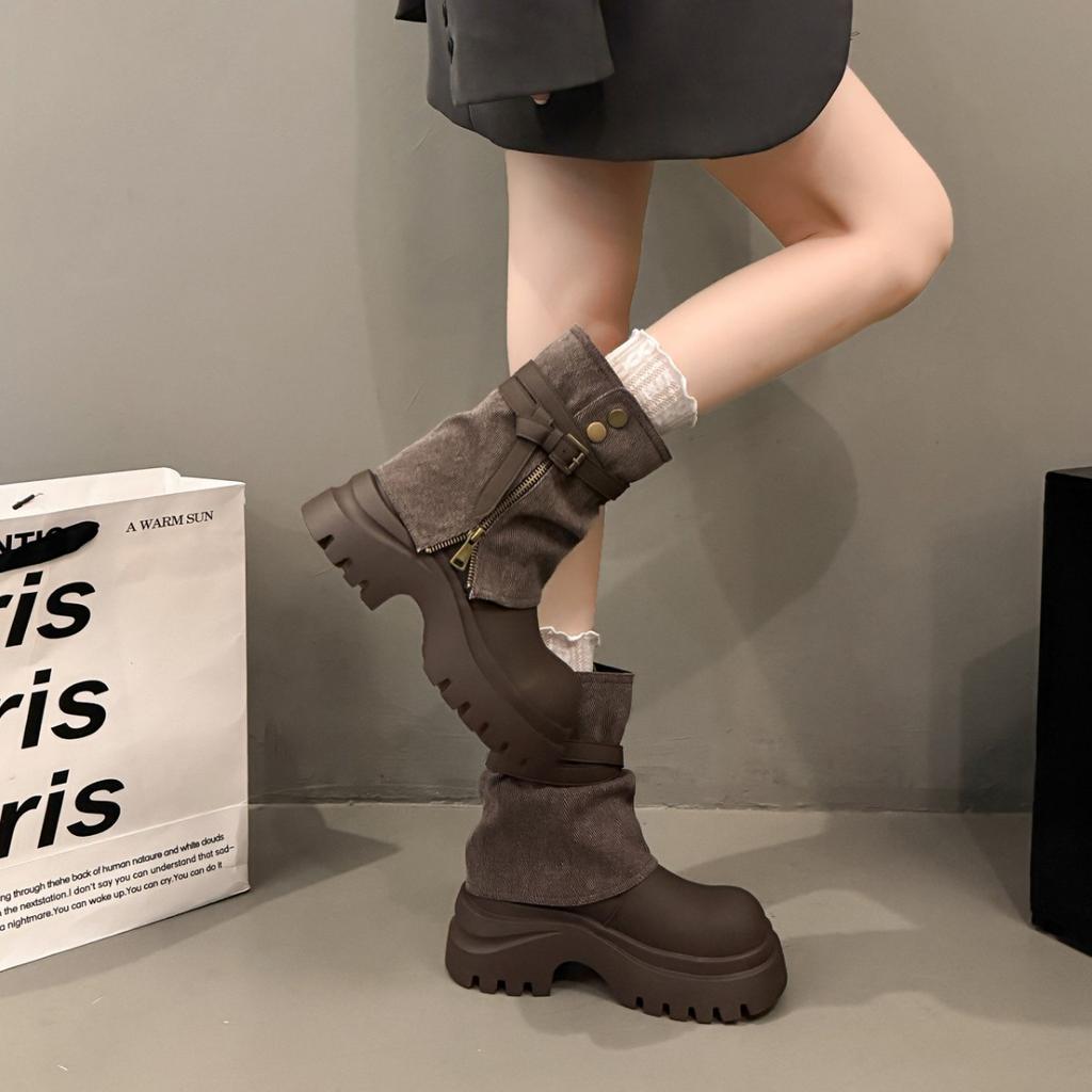 Модные универсальные ковбойские сапоги женские осень 2025 новые на толстой подошве темпераментные сапоги-трубы для брюк увеличивающие рост маленькие ботинки Мартина