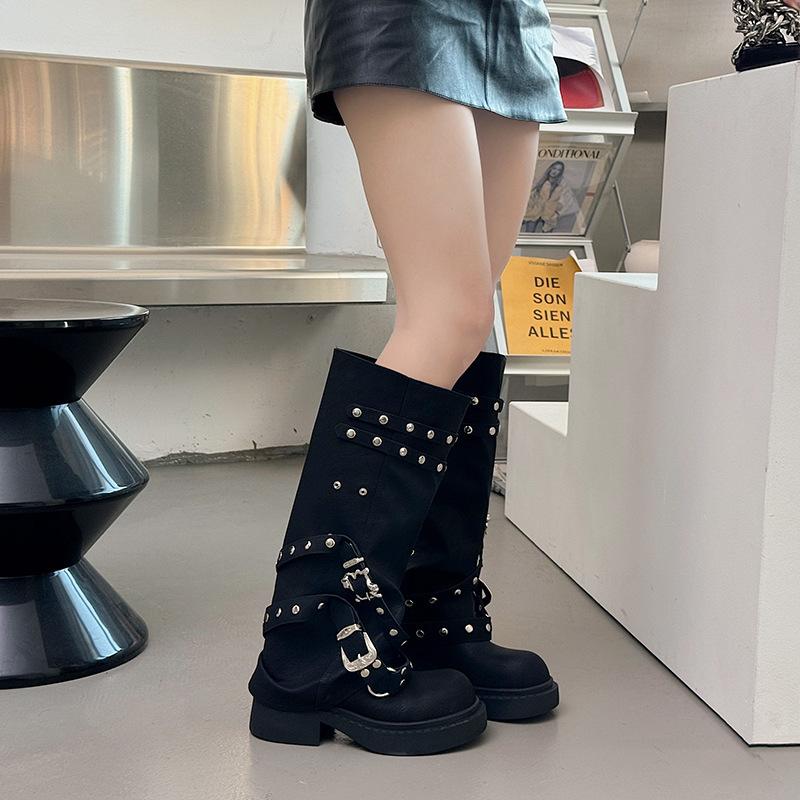 Ботильоны-чулки черные с заклепками женские 2025 новые круглый носок нишевый дизайн ботинки на толстой подошве рыцарские ботинки