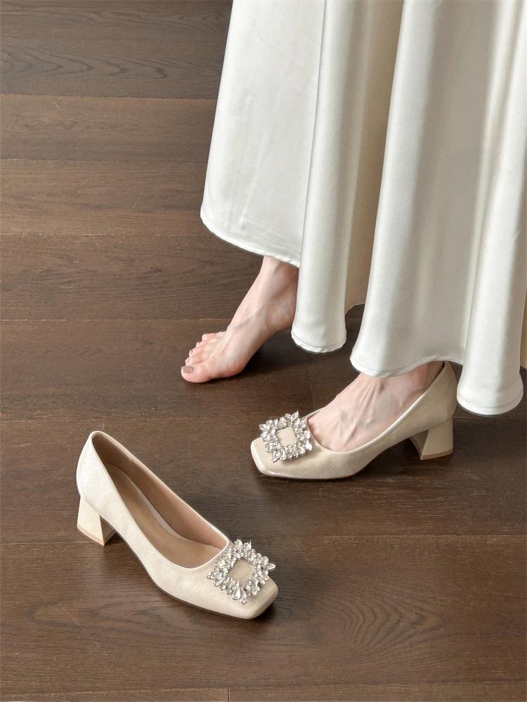 French rhinestone square buckle satin light mouth single shoes women's new temperament square head thick heel high heels