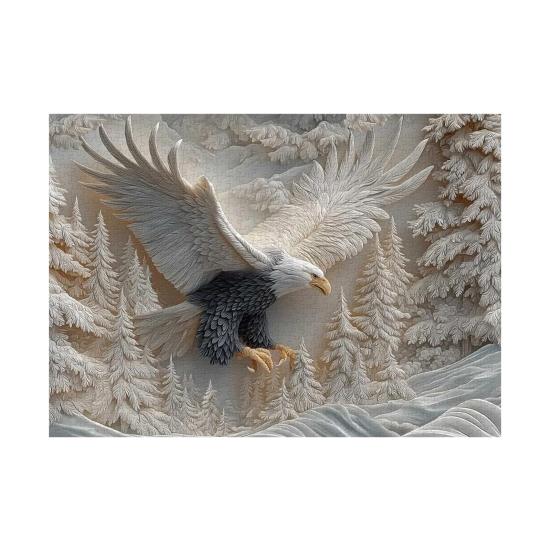 Сложный дизайн с резным лесом добавляет глубину и художественность пазлу, с текстурированными деревьями и пастельными тонами, напоминающими шедевр ручной резьбы.. В центре пазла — летящий белоголовый орлан, его крылья и когти широко расправлены, символизирующие силу, грацию и свободу движения.
