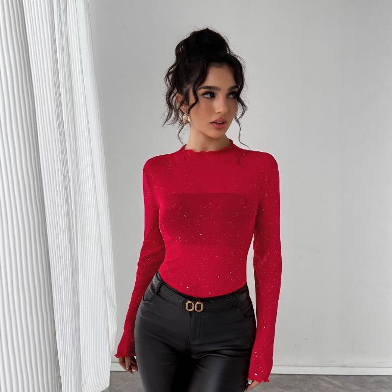 Осень 2025 Новый Топ с пайетками для женщин Приталенный Длинные рукава Блестящий Блестящий Тонкий Топ для работы