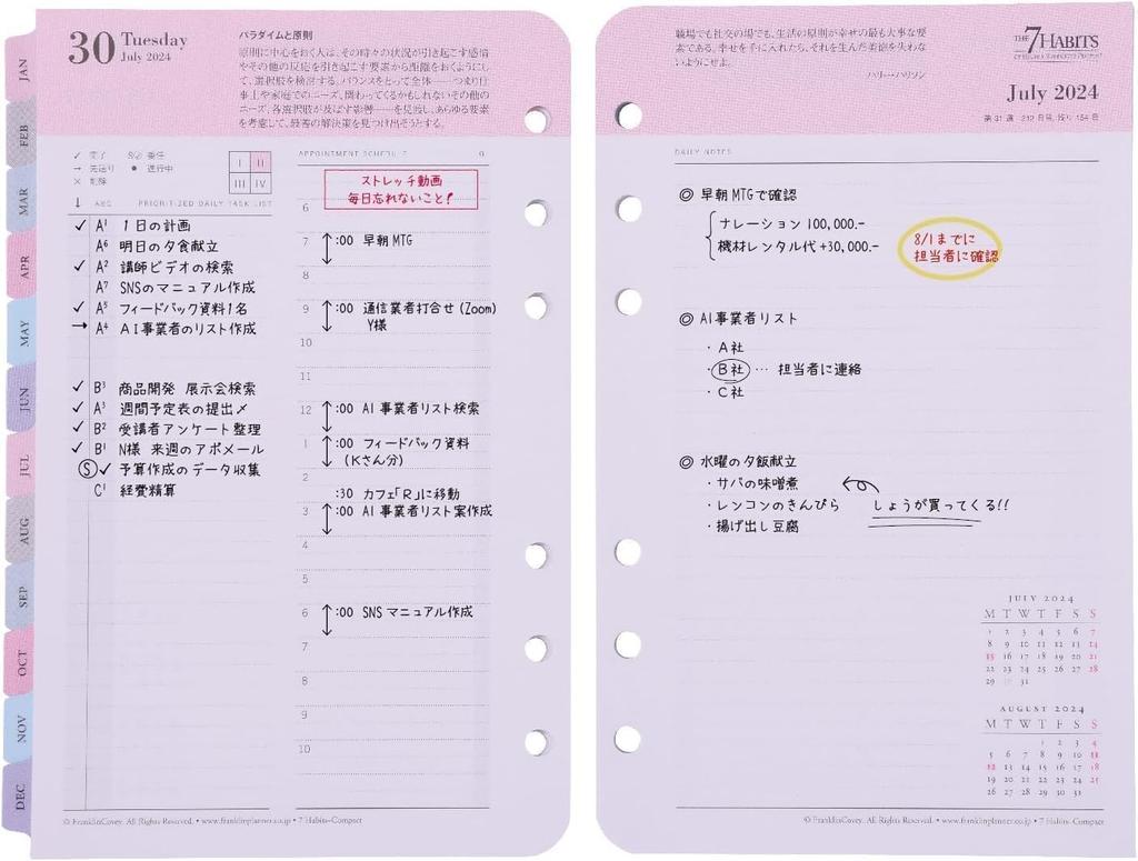 The daily pages are the most standard type of Franklin Planner, consisting of two double-page spreads for one day's schedule and task management, along with a notes section.