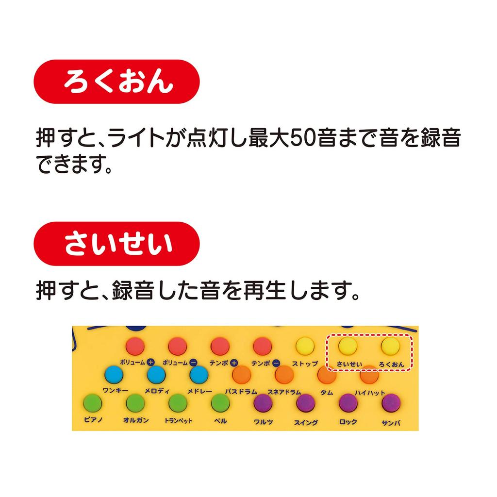[Enjoy a variety of performances] Choose from eight different instrument sounds and rhythm patterns, allowing you to enjoy a variety of performances, and you can also record and play them back. Instrument sounds: Piano / Flute / Organ / Trumpet / Xylophone / Music Box / Bass / Violin Rhythm patterns: Waltz / Rock / Samba / Pop / Country / Rumba / 8-beat / 16-beat