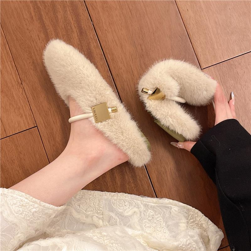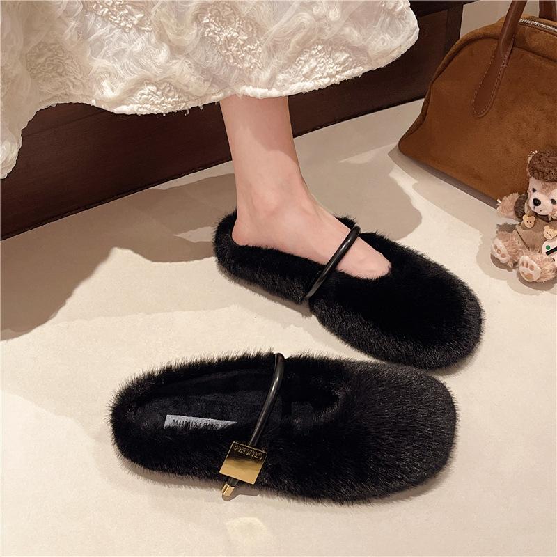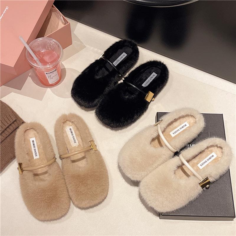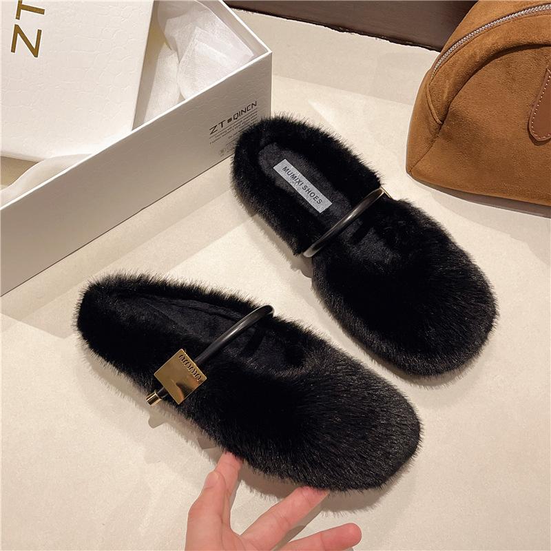 Ретро простые пушистые туфли для женщин 2025 зимняя обувь на плоской подошве, туфли-бини на один педаль для женщин, бархатные универсальные хлопковые тапочки для женщин