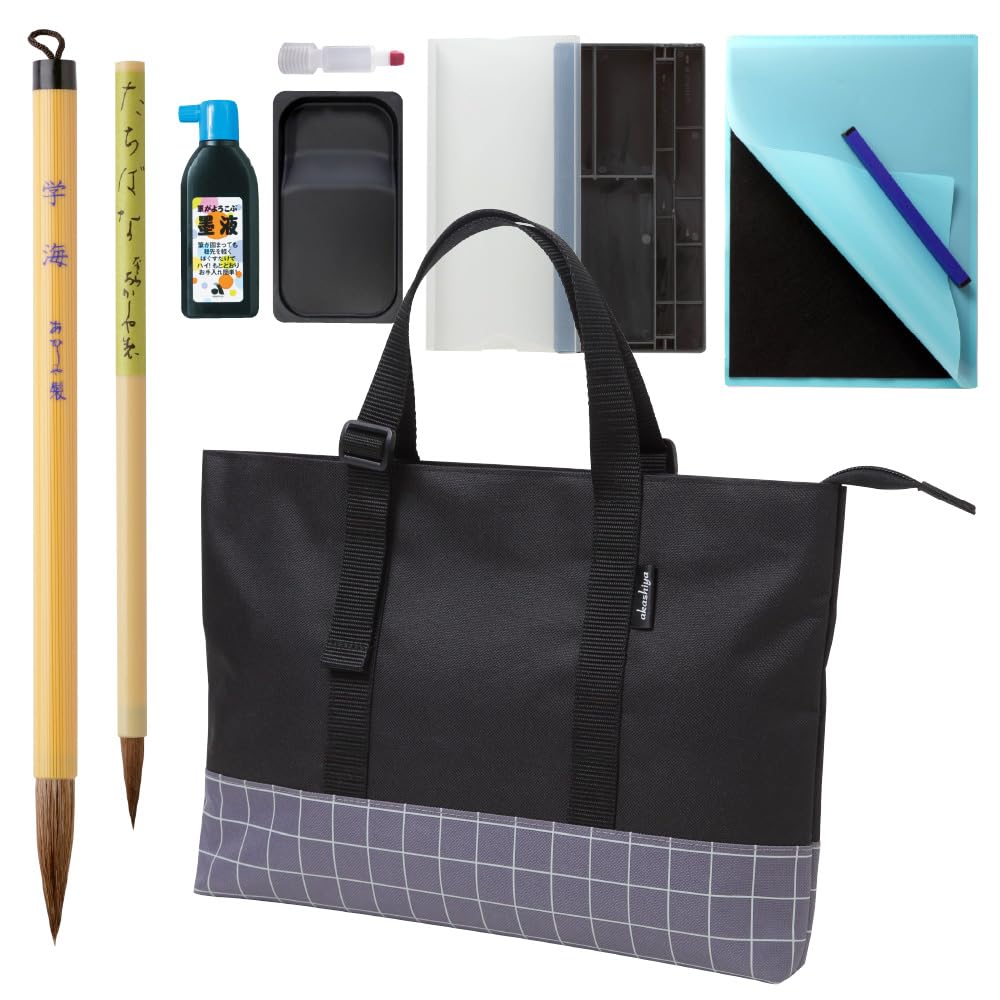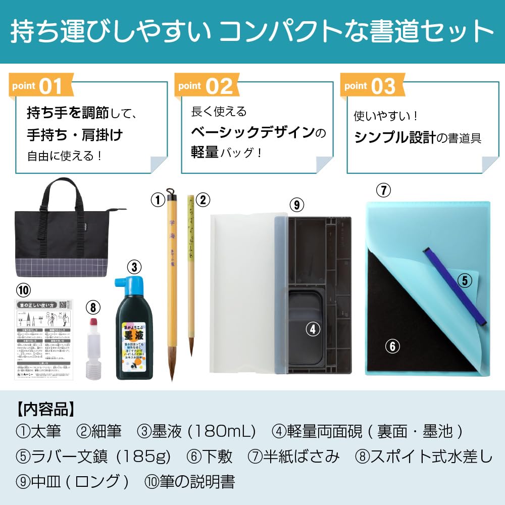 Contents: Thick brush, fine brush, ink (180ml), lightweight double-sided inkstone (front: inkstone, back: ink pond), rubber paperweight (185g), writing pad, calligraphy paper clip, dropper-style water pitcher, calligraphy tool storage case, brush instruction manual.