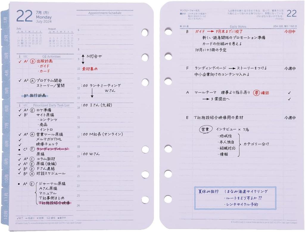 The left page features space for recording prioritized tasks, progress, and your daily schedule.