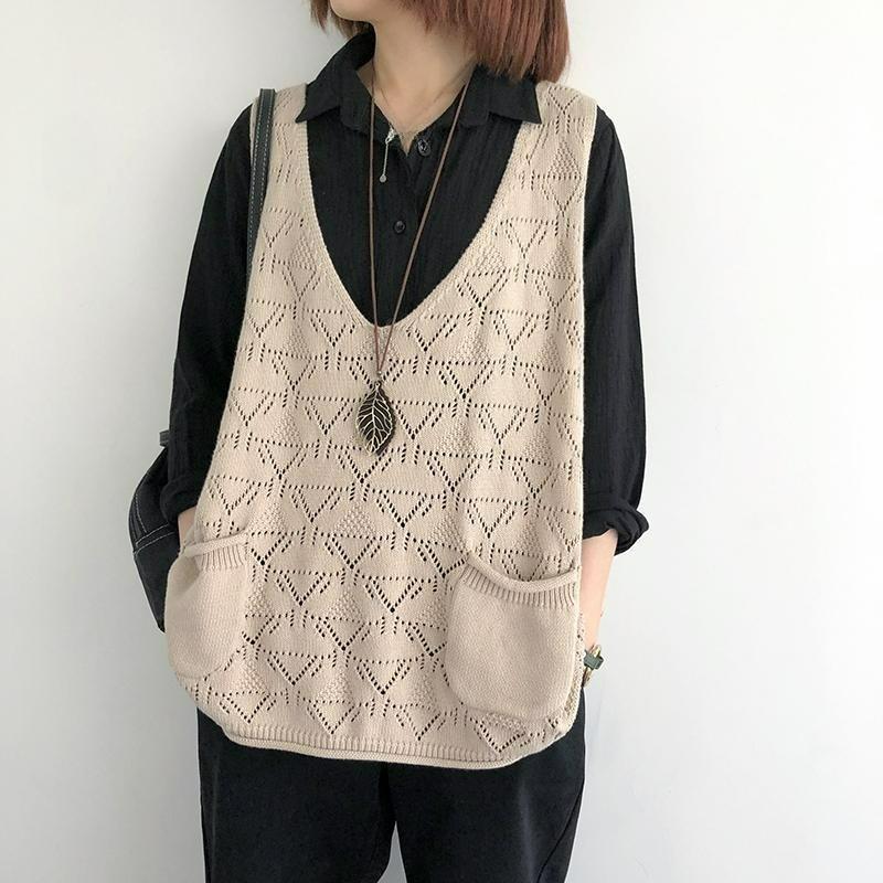 Женский вязаный жилет с ромбовидным узором и V-образным вырезом, весенне-осенний свободный жилет для верхней одежды, ажурный жилет-свитер, повседневный жилет без рукавов