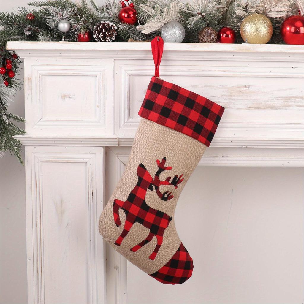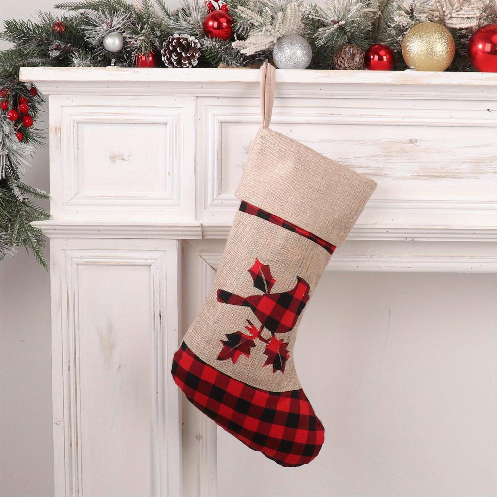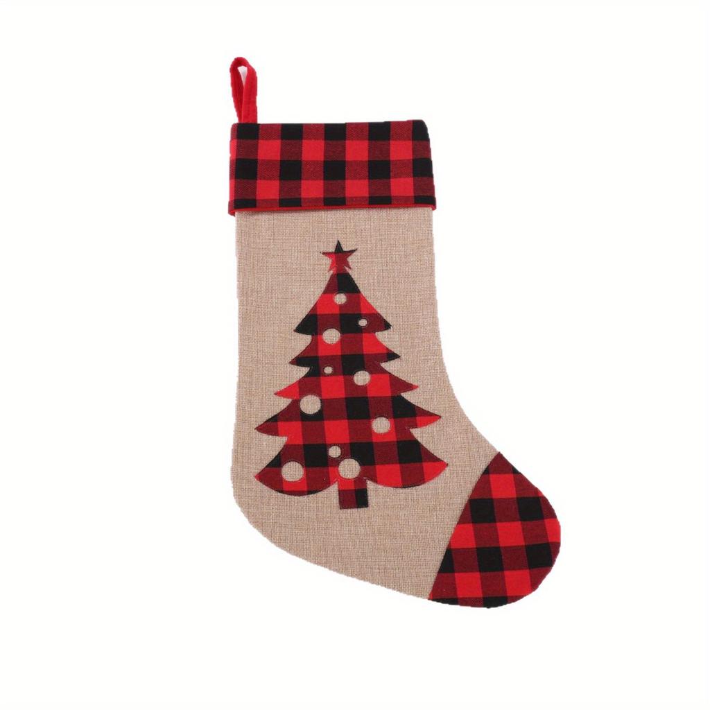 1 шт. Красный и черный клетчатый рождественский чулок из имитации льна с аппликацией и вышивкой, рождественский подарок