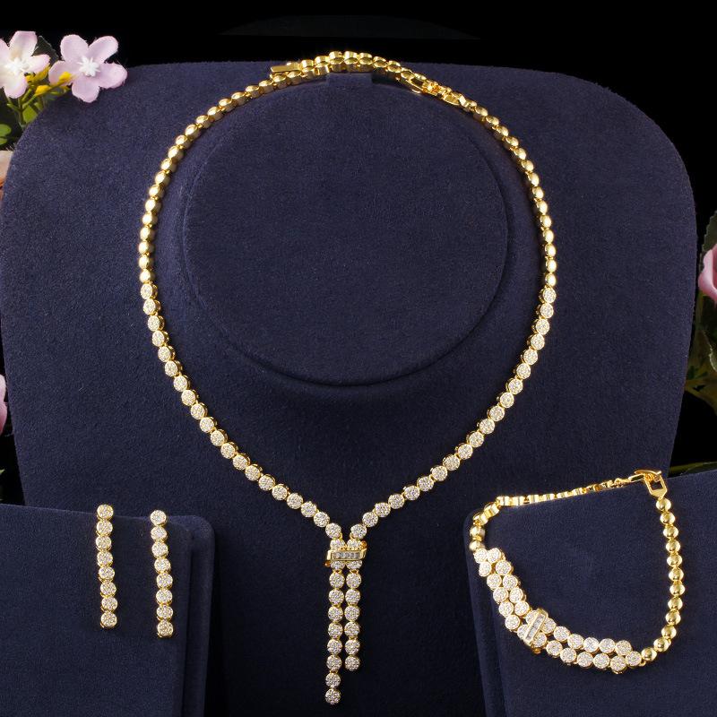 T0151 Свадебное колье с гальваническим золотым покрытием, колье с микро-вставками из циркона, серьги, браслет, набор из трех предметов, свадебные аксессуары