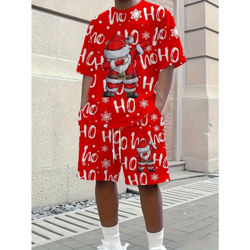 Летняя мода с принтом на тему Санта-Клауса, свободная, удобная мужская спортивная одежда-двойка с короткими рукавами