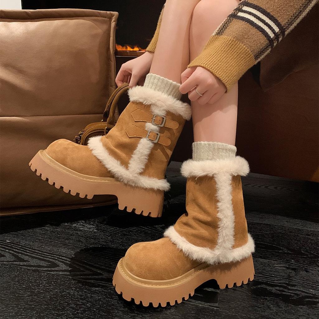 Зимние женские сапоги-дутики средней высоты на толстой подошве, новинка 2025 года, с интегрированным флисом и мехом, теплые шерстяные хлопковые ботинки «Алтай»
