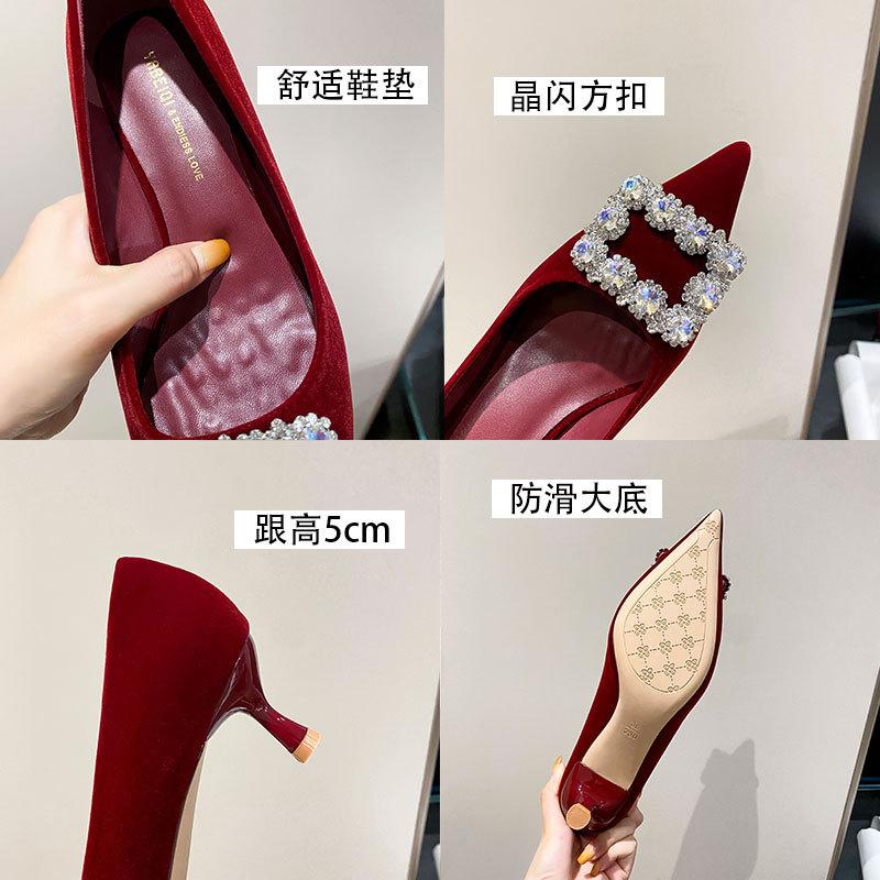 Источник свадебные туфли женские 2025 новые туфли невесты Сюхэ тонкий каблук красные высокие каблуки замша стразы острый носок одинарные туфли