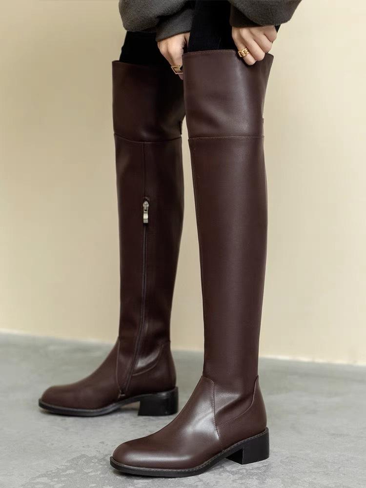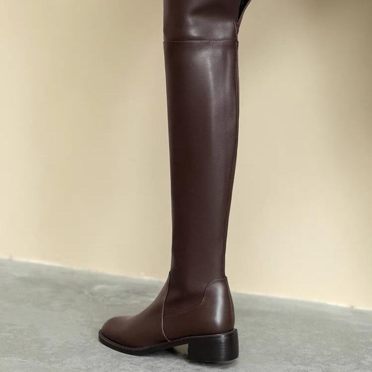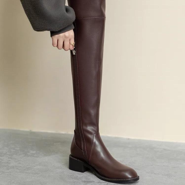 2025 Корейская версия показывает ноги стройными ботфорты выше колена женские на низком каблуке увеличивают обхват ноги зимние тонкие бархатные высокие рыцарские сапоги коричневые