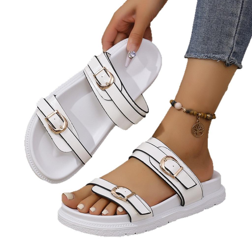 За летний новый продукт 2025 с пустой женской обувью однотонная пряжка дышащие круглый носок плоская подошва крутые тапочки