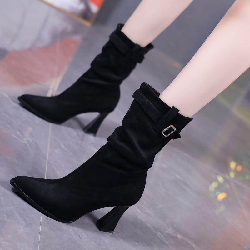 Темпераментная пряжка на ремне, высокий каблук, полусапоги, женские 2025, зима, новые, хаки, плиссированный рукав, тонкий каблук, ботильоны на наборном каблуке